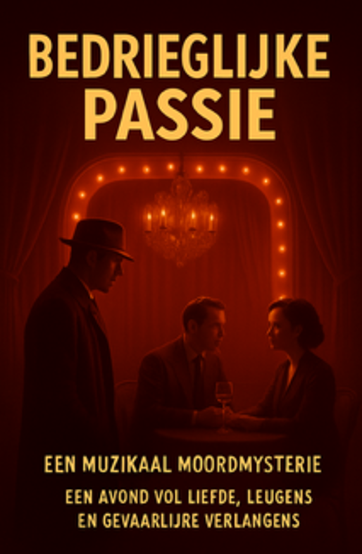 Welkom in ons Muzikaal MoordMysterie Café. Kom binnen. Neem plaats. En wees gewaarschuwd – liefde kan dodelijk zijn. In het roodfluwelen décor van een rokerige bar ontmoeten passie en jaloezie elkaar. Op het tafelblad staat een eenzaam glas, de vloeistof erin gevangen in het schijnsel, alsof het bewijs is van een aanwezigheid die verdwenen is. Alles ademt verwachting, of misschien dreiging. In deze stilte kan elk moment een geheim worden onthuld, of een leugen worden geboren. Terwijl het koor zingt en de rechercheur vragen stelt, komt steeds meer van de waarheid aan het licht. Wat begint als een romantisch drama, verandert in een bloedstollend onderzoek vol jaloezie, overspel en verraad. Laat u verrassen door verleidelijke liederen, snijdende dialogen en een moord die niemand had voorzien.